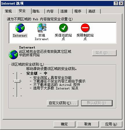 在"安全"的设置里,中间偏下有两个按钮,点击按钮"自定义级别"(Customized)