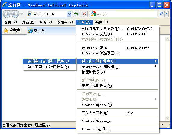1.在IE菜单中,选[工具]->[弹出窗口阻止程序]