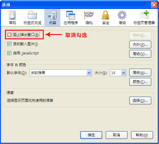 3.在[内容]选项中,将[阻止弹出窗口]前的勾去掉
